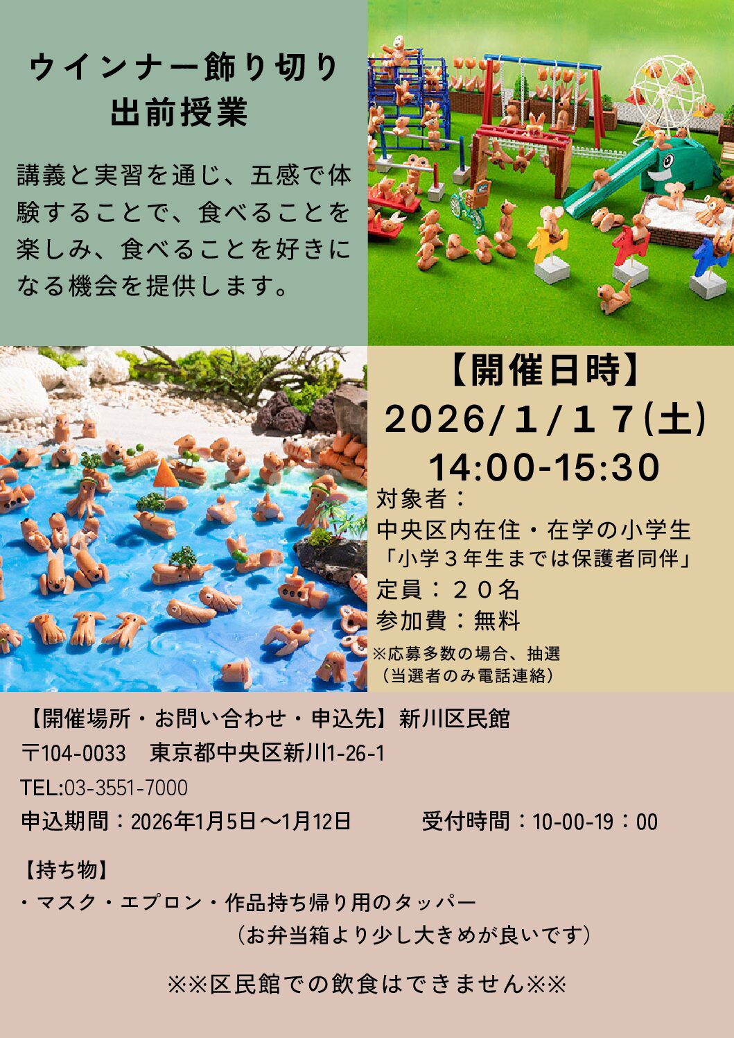 日本ハムカスタマーコミュニケーション株式会社のみなさまにご協力いただき ウインナー飾り切り出前授業を開催します! 講義と実習を通じ、五感で体験することで、食べることを楽しみ、食べることを好きになる食育講座です。 区民館での飲食はできないため、出来上がった作品はお持ち帰りいただきます。 小学生対象に開催します。ぜひみなさまお越しください。