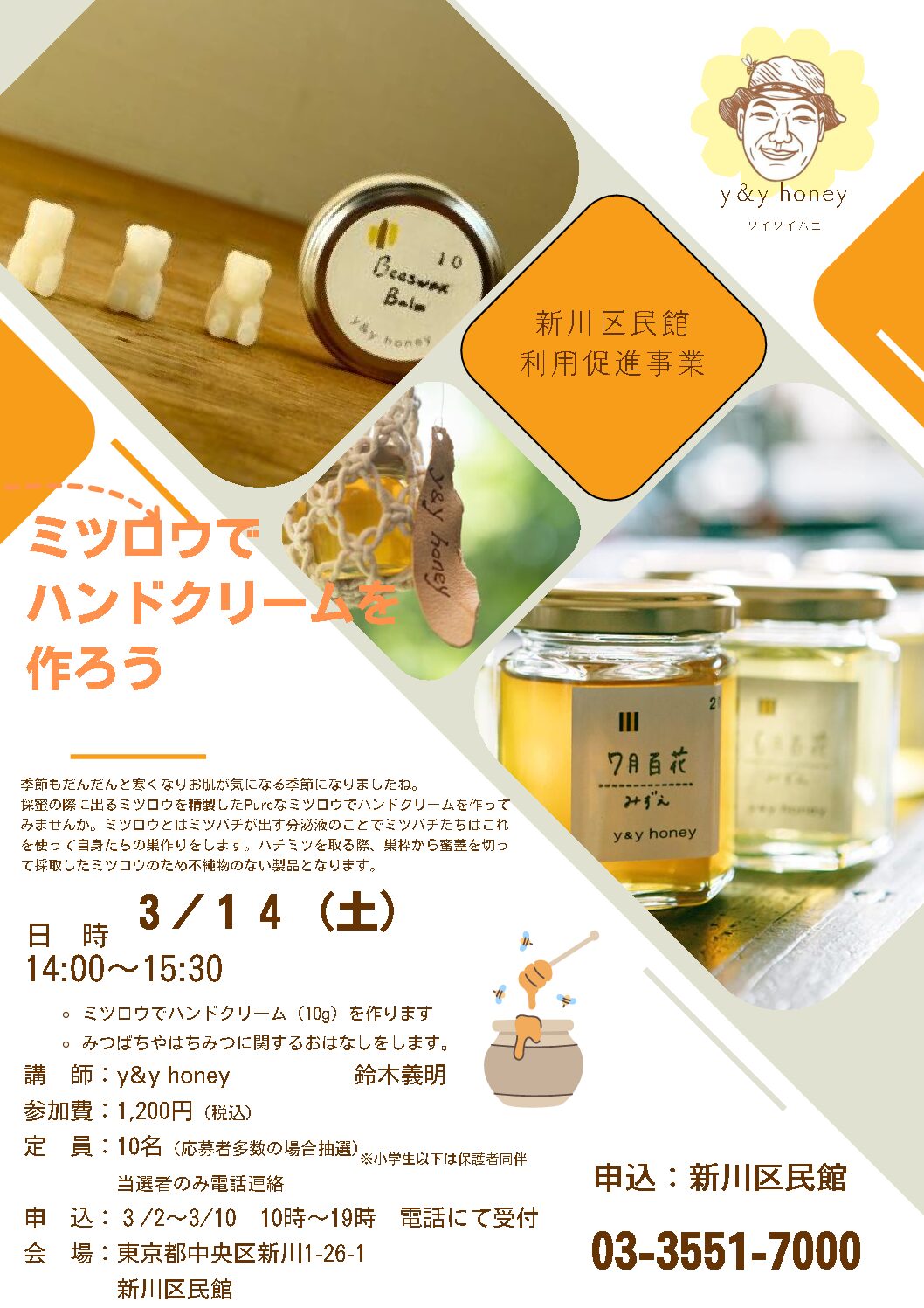 🐝🐝採蜜の際にハチミツから出るミツロウを精製してハンドクリーム作りを体験する講座です。🐝🐝